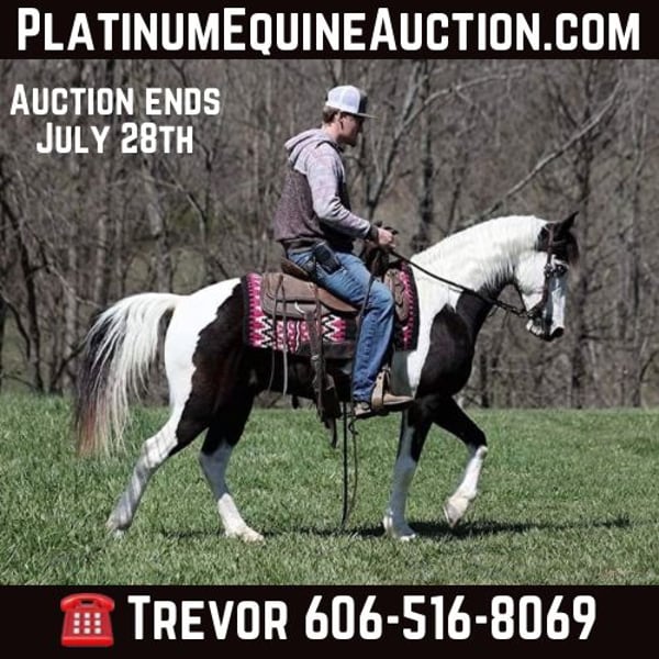 ONLINE AUCTION Place your bids at www.PlatinumEquineAuction.com Starting Bid $3500 Auction ends July 28th, 2024 Need a new saddle? Check out White Rock Saddles on our website or Facebook! Taco is an eye catching black/white tobiano, gelding that is standing 14.1hh and he is 10 yrs old. Taco has been on camping trips, picket line tied and hauled to several states. He will flatfoot walk on a loose rein or he can move on out if you ask. He has a smooth and natural 4-beat gait that anyone will enjoy riding on! He can gait on out around 10mph or walk on a loose rein as well. Taco has been shown at local fun shows in pleasure classes and seen it all from the bright lights to hearing those blairing loud speakers. Taco has seen it all and handles everything in stride! He has been exposed to all kinds of wildlife such as deer or turkey or other animals like cows or dogs and will go anywhere that he is asked too. He has been rode many miles in the mountains of Eastern Kentucky and encountered every obstacle possible on the trail. He will go up or down even the steepest slopes, across deep creeks, over downed trees, and over all types of rough terrain while still being sure footed. He has been rode in traffic, and is very traffic safe around cars, semi, log, and dump trucks. If you are looking for that special trail riding partner, then look no further!! Feel free to call Trevor Patrick 606-516-8069 with any questions. ONLINE AUCTION Place your bids at www.PlatinumEquineAuction.com Starting Bid $3500 Auction ends July 28th, 2024 Need a new saddle? Check out White Rock Saddles on our website or Facebook!