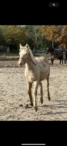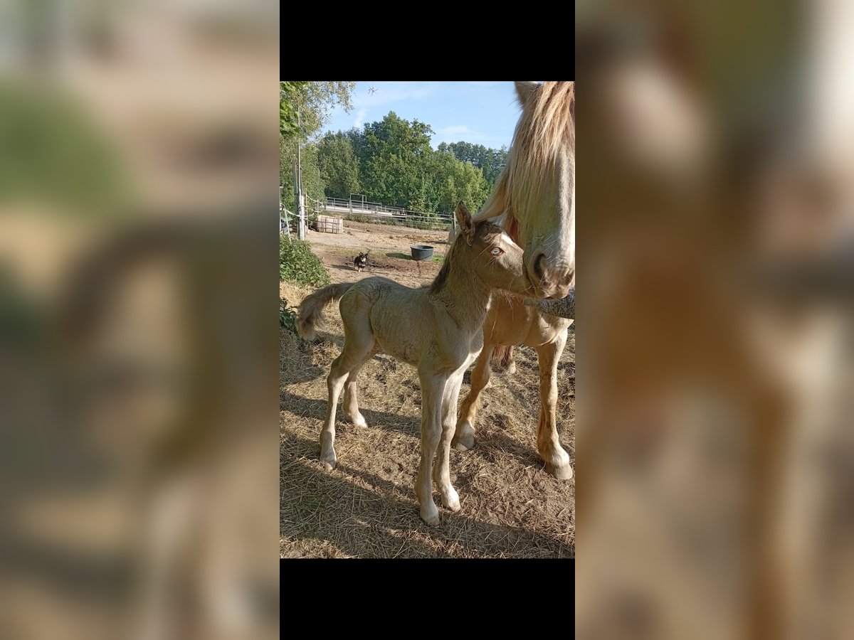 For sale is a typey Tinker stallion born on May 21, 2025. He is in the rare champagne color with green eyes and already displays a very baroque conformation. The expected final height is approximately 13.5 hh. The stallion is healthy and is already familiar with basic foal handling. A promising foal with a stunning color and presence, suitable for leisure, show, or future breeding.