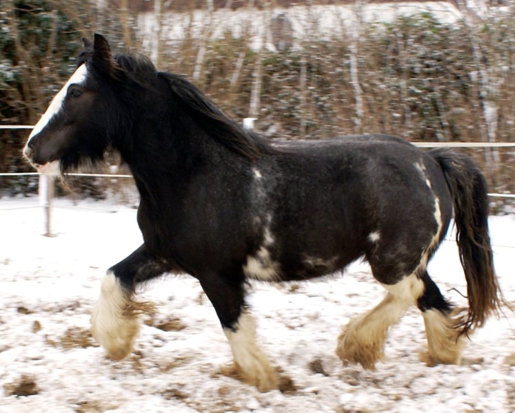 Knuffige black blagdon Tinkerstute, auffällige Optik mit schönem Exterieur, brav angeritten, hat Freude an Freispringen und springt auch mit toller Art, kennt Hunde und Traktoren, gibt brav Hufe, keine Rehe oder Mauke, artig im Umgang und unter dem Sattel