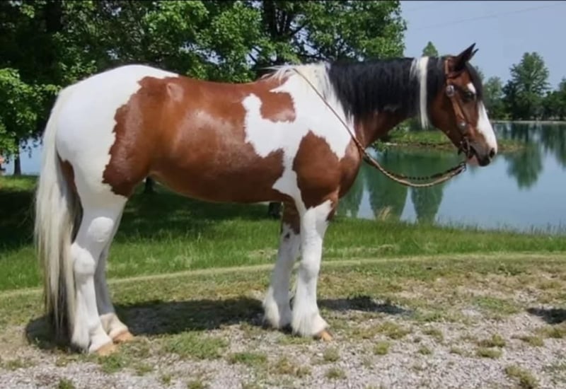 ONLINE AUCTION Place your bids at www.PlatinumEquineAuction.com Starting Bid $3500 Auction ends May 4th, 2025 Need a new saddle? Check out White Rock Saddles on our website or Facebook! I’m so excited to present to you Karoline 2017 Gypsy Vanner Cross. She stands 14.2 hands and weighs 1150lbs. She has it all, the gypsy vanner look, but the athletic ability to go in any direction you choose to take her in. Not only is she stunning to look at and a pleasure to be around, she’s extremely broke. Whether you’re wanting to spend the day riding down the trails, doing lessons, pushing cattle, jumping, or just pampering your best friend Karoline is your lady! Karoline has a willing attitude that makes her so special. She has great ground manners that make her incredibly easy to be around. Karoline has had only 2 owners her entire life. I’ve had the privilege of being around her for over two year. We have had her in training for the past year. She is only being offered for sale because a dear friend(owner) has decided she will no longer be riding. We ABSOLUTELY love Karoline. Karoline will ride away from the barn by himself or in big groups. She is always willing to go anywhere you point him and enjoys the trail obstacles. Karoline is broke better then most gypsy, she is not heavy or not dull. She will ride around with or without a bridle, side passes, moves her hips, is soft in the mouth, backs, and is user friendly for any level rider young or old. Karoline is traffic safe and tarps, bull whips, dogs, kids don’t faze her. She will stand all day for grooming and enjoys being pampered. She will also side pass to mounting block, picnic table, log or trailer fender to make mounting easy. Karoline is currently barefoot and has never needed a set of shoes. She stands great for the farrier, saddling, bathing, and clipping. She is easy to bridle as well. She is easy to catch in the feild and prefers to live outside, but also has great stall manners. She sells 100% sound no vices. She is UTD on shots and vaccinations. PPE are welcome. Make an appointment today to try Karoline. Check out her MUST SEE VIDEO Owner Cinthia Bowling, Contact (Agent) Jessica Bunch 434-981-3863 Located in Robards, KY. ONLINE AUCTION Place your bids at www.PlatinumEquineAuction.com Starting Bid $3500 Auction ends May 4th, 2025 Need a new saddle? Check out White Rock Saddles on our website or Facebook!