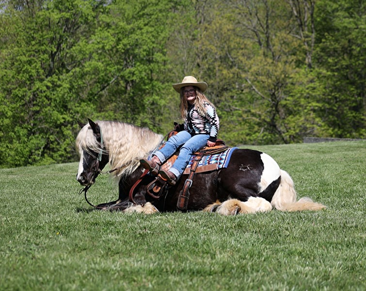 Consigned to Cowgirl Cadillacs in Sheridan, WY. Sales June 14-15th. You can bid online, phone bid or bid in person! Sweet dreams are made of this!!! CROSS CREEK SUGARFOOT could not have a more fitting name than “Sugar”! He is the sweetest horse with the most inquisitive personality and he has NEVER met a stranger! He loves for the kids to take him to the “beauty shop”; bath time, getting his hair done and being all sparkled up are his favorite things! This horse is without a doubt a real life “Barbie” horse. Sugar is a well built 14.2hh, 4 year old, rare silver dapple tobiano, registered Gypsy Vanner gelding! People love these gypsies for their versatility and calm nature and Sugar is a true testament to the breed! He has been ridden around the ranch, pushed cows, pasture roped and doctored. He has been ridden by kids down the highways, through town and is safe around all traffic. He loves to hit the trails and just cruise along slow and easy! He will cross creeks, ditches, logs and navigate rough rocky areas while taking care of the most precious of cargo(rider)! Sugar has been exposed to all kinds of wildlife and will go anywhere that he is asked too. He has a smooth jog, a nice lope, he reins around and turns a circle both ways, sides passes and backs with ease! Sugar has some tricks “up his feathers” and will lay down for mounting/dismounting. Sugar has been ridden by all ages of kids from 4 on up and can suit any rider’s ability level. If you have big dreams of that special riding partner and best friend, sweet dreams do come true… just add Sugar! Call 606-308-2461 for more info.