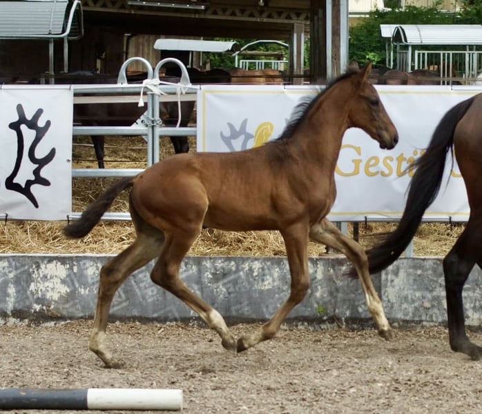 Beautifully built athlete with top character. A foal that knows how to please with its appearance and type and is equipped with three good basic gaits. Premium foal, rated with 55.5 points. Also of interest to stallion breeders. Sire Lossow - known for top-class foals. From his offspring, Räuberfürst (out of Räuberliebe by Finley M) First Sight (out of Fünflinden by Hibiskus) and his full brother First Impression as well as Elanolos (out of Elisa AA by Esteban xx) are still fondly remembered from the 2021 licensing. Lossow's undoubtedly most successful offspring is Isselhook's First Sight TSF, born in 2014 and discovered by Inge Weißkirchen: under Sophie Leube, he was Bundeschampion as a five-year-old, Trakehner Eventing Champion as a six-year-old and placed in the final at the World Championships for Young Eventing Horses. After his sale to US rider Janine Shoffner, Alex Green Kerby rode him to the United States Eventing Association's "Stallion of the Year" award in 2021. Olympic rider Doug Payne is now in the saddle on the bay.