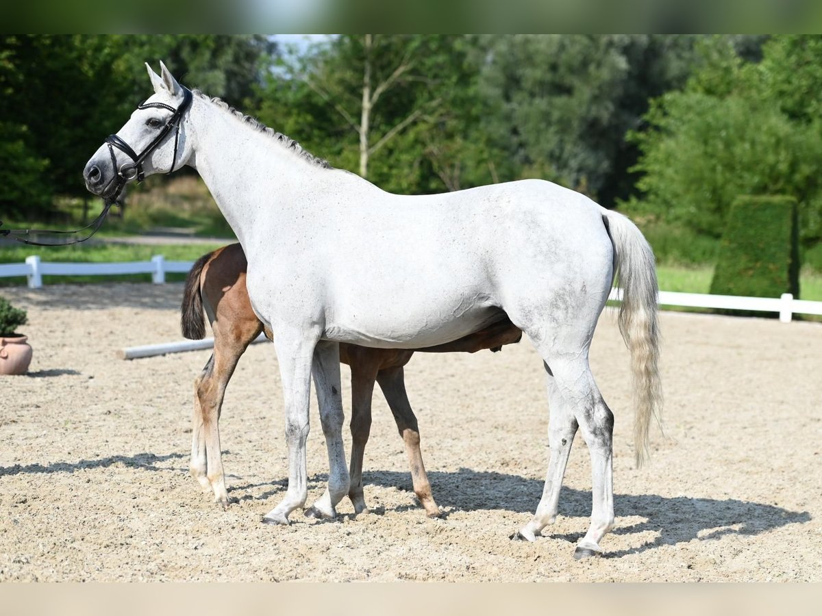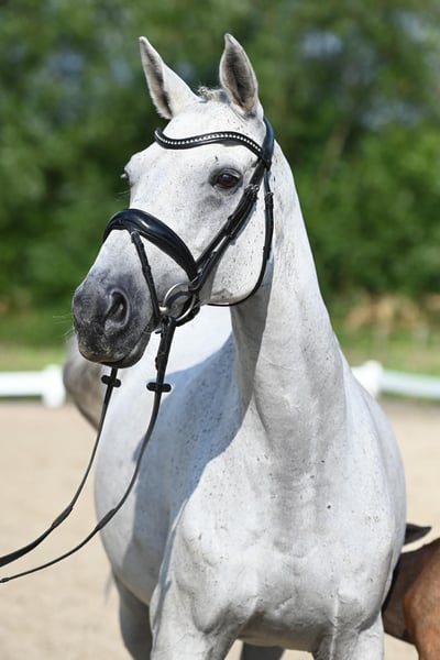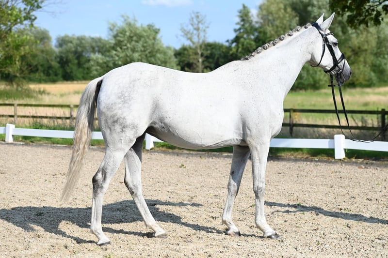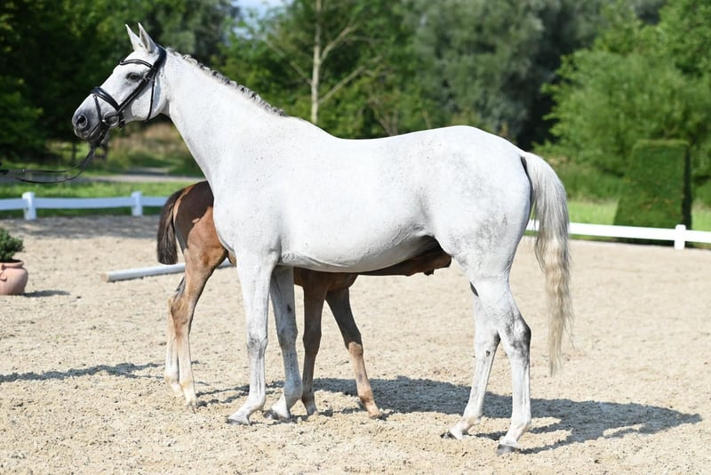 Belle Occasion Go is a wonderful gray mare who embodies a very special breeding value due to her exquisite performance genetics: One of the very few daughters of the Anglo-Arabian Bouquet AA and therefore a granddaughter of the outstanding performance sire Bajar ShA. Her sire personally asserted himself in the advanced level course and produced a large number of sport horses that were highly successful in eventing and jumping competitions up to the highest level. Her maternal line is also characterized by the best blood: Her dam is one of the few daughters of the Acatenango xx son Wörthersee xx, who left the breeding scene far too early. Granddam Belle Etoile Go is by the Mazagran son Rittersporn, who was successful in advanced (S) level courses under Ulrich Meyer zu Bexten. Belle Occasion Go has a wonderful interior, is always calm and friendly and can hardly be ruffled by anything. She proved to be very fertile with us: two promising colts by Sea Lion xx and Belun from the 2023 and 2024 crops are growing up. She was not covered in 2024! Several years ago, she suffered an accident due to external influences, which affected the tendon of her front foot. As a result, she can no longer be used under the rider, but only for breeding. Belle Occasion Go is only being sold for reasons of space; we would like to find her a new, well-cared-for breeding task and new owners who appreciate and correctly recognize her breeding value.