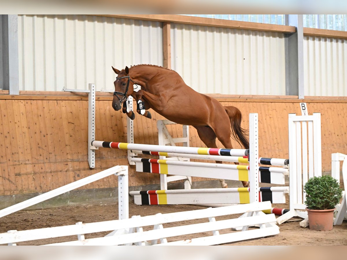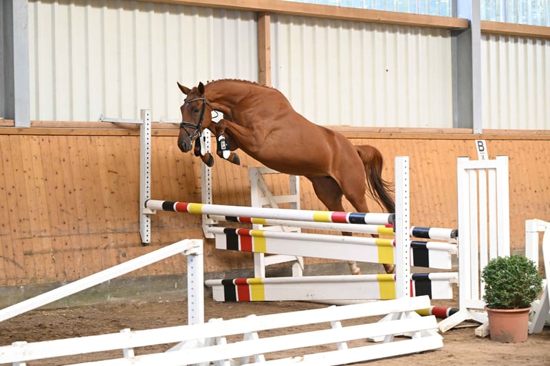 This is a very wiry athlete, still at the very beginning of her training, who will certainly have her future sporting career in eventing or show jumping. Her movements are very practical and she feels particularly comfortable over the poles, always acting with an overview, good technique and a fast front leg, so that you can already imagine the jumps very well under the rider. The sire Burma Gold xx was bred by Gestüt Ammerland and has a GAG of 94kg. He was, among other things, champion of the three-year-old stayers in Italy, won the Premio St. Leger Italiano and was second in the German St. Leger. The pedigree continues with the thoroughbred Cavallieri xx, former state stud stallion in Marbach, who has produced plenty of powerful offspring. The pedigree is rounded off with two Trakehner dressage heroes, Hohenstein and Saint Cloud, who are sure to give this mare the finest and best rideability characteristics.