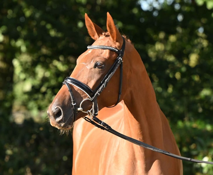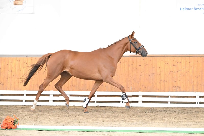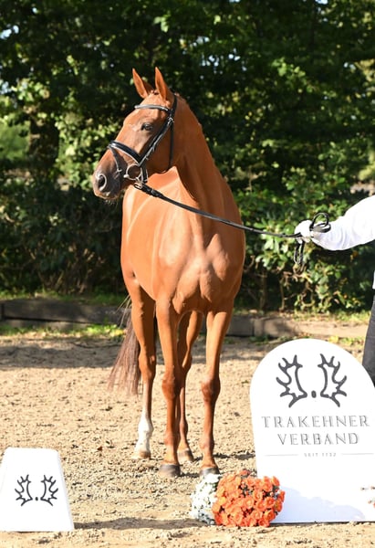 C'est une athlète très filiforme qui se présente ici, encore au début de sa formation, et qui fera certainement sa future carrière sportive en concours complet ou en saut d'obstacles. Très pratique dans ses mouvements, elle est particulièrement à l'aise sur les barres, agissant toujours avec une bonne vue d'ensemble, une bonne technique et des antérieurs rapides, de sorte que l'on peut déjà très bien s'imaginer les sauts sous le cavalier. Son père, Burma Gold xx, a été élevé par le haras d'Ammerland et a un PMG de 94 kg. Il a été, entre autres, champion des trois ans en Italie, a remporté le Premio St. Leger Italiano et a terminé deuxième du St. Le pedigree se poursuit avec le pur-sang Cavallieri xx, ancien étalon de campagne à Marbach, qui a produit une nombreuse descendance performante. Le pedigree est complété par deux héros du dressage trakehner, Hohenstein et Saint Cloud, qui confèrent à cette jument les meilleures caractéristiques de maniabilité.