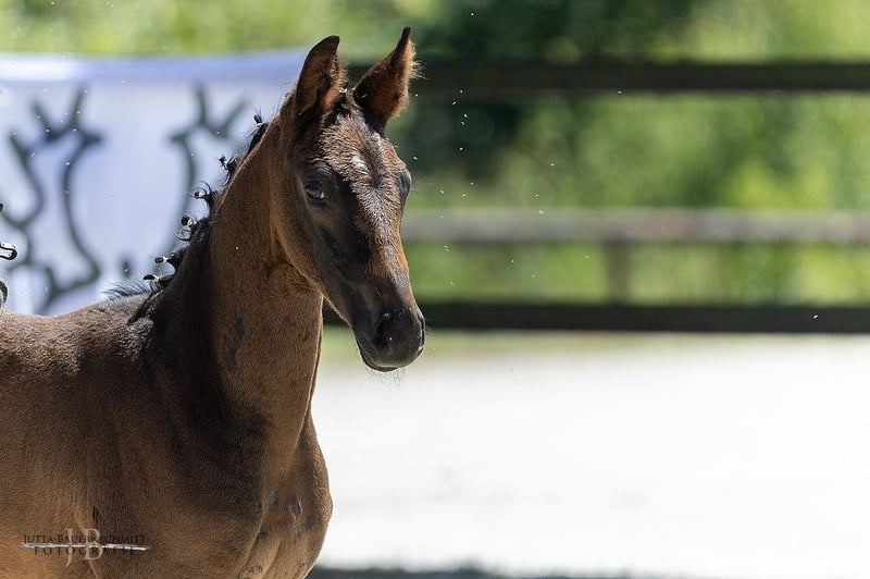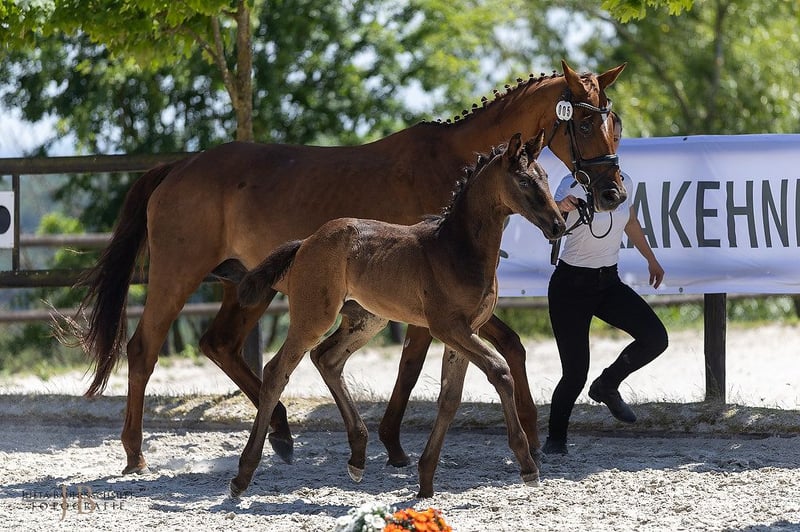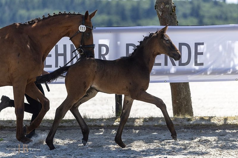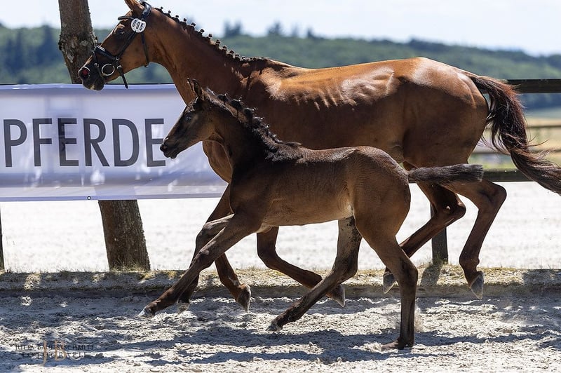 Stallion debut for a very special young stallion: First Impression is the full brother of the Bundeschampion Isselhook's First Sight TSF, a true eventing hero who also managed to place in the final of the World Championship for Young Eventing Horses and was honored in the USA for his sporting achievements. His offspring is characterized by the unmistakable athleticism of her father, who impressed during his licensing with power in his movement and confident abilities over jumps. She captivates with her noble appearance, featuring significantly constructed body parts, and moves away with strength, propulsion, and scope. From a sporting perspective, her mother’s lineage is also of high caliber, as the Anglo-Arab Fandsy AA connects another athletic hero in eventing with the rideability stallion Guy Laroche. From the lineage of the dressage champion and sire Unicato!