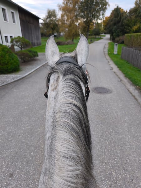 If everything fits, I am offering my 9-year-old grey mare, Milla. She is very well-behaved in handling, does not kick or bite. In the herd, she tends to be relatively high-ranking and is barefoot. Over the past two years, she has mostly been ridden in groups or as a second horse on trail rides, and she is very calm in all three gaits. Sometimes a bit watchful, but not spooky. If something seems unfamiliar to her, she will stop and observe. She is always manageable on the ground. We haven't been out alone. In the riding arena or indoor school, she can be a bit tricky to ride; she has had some bad experiences there in the past, which sometimes causes her to act up or become a bit more spirited. However, she learns very quickly when you work with her consistently. She is never mean, and she does not buck or rear. Overall, she is a spirited horse that enjoys moving and I could very well imagine her on trail rides. Not suitable for beginners! The dressage saddle, which was fitted by the saddle fitter, and her blankets are included. I am looking for a wonderful home where there is enough time to dedicate to her.