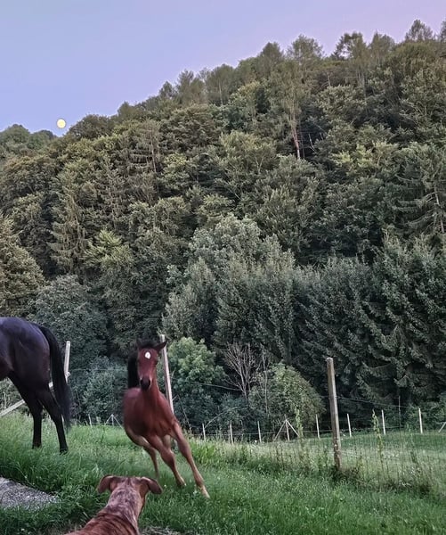Gerne auch Tausch gegen Appaloosa, Paint, Quarter, Knabstrupper, Isländer, Norweger, ... Safirina ist ein liebes Vollblutaraber Stutfohlen, geb. am 18.06.2025. Sie hat Abstammungspapiere: Die Mutterstute Safira ist rein ägyptisch gezogen und hat ordentlich GO - frei sowie unterm Sattel. Der Vater Ahil ist seit Jahren in unserem Besitz, ist ein tolles Hand- und Reitpferd und kann sogar einige Tricks. Er ist der Enkel von unserem ersten Pferd Samra B. Da ich selbst keine Interessen hatte jemals Wettkämpfe zu bestreiten, wurden meine Pferde nie irgendwelchen Turnieren ausgesetzt. Sie kennen jedoch Ausdauer, Springen und feinste Anordnungen durch Gewichts- und Schenkelverlagerungen draußen am Feld und in der Manege (hier auch ohne Sattel/Zaumzeug/Halfter). Safirina lebt zurzeit mit ihren Eltern und einem weiteren Pferd im Offenstall auf einem kleinen Bauernhof. Sie lernte das Fohlen-ABC mit Liebe und Geduld kennen: - Halftern - Führen - Anbinden - Putzen - Tierarzt - Schmidt und ist bereits 2x im Hänger für 10-15 min gefahren. Sie ist sehr menschenbezogen und kommt aus der Herde meist als Erste auf einen zu. Aufgrund ihrer tollen Eigenschaften und der Eigenschaften der Eltern wird sie bestimmt ein Partner fürs Leben. 🥰 Standort: Spielfeld, Südsteiermark
