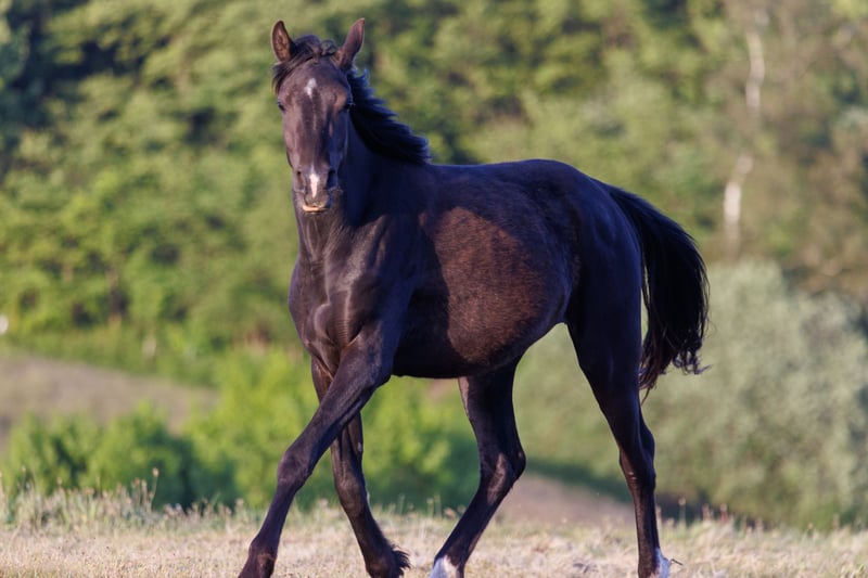 Ein schwarzes Fohlen, das im Feld steht — stark, neugierig, lebendig — und ihr Erbe weiterträgt.