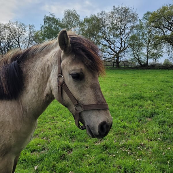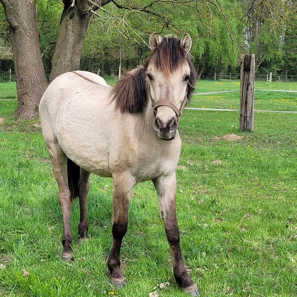 Cookie ist als Deutscher Falbe eingetragen. Auf den ersten Blick fällt er durch seine ungewöhnliche grau-gelbe Farbe und die schönen Augen auf. Sein Vater Champ de Lux ist Elitehengst, der Cookie auch die voraussichtliche Pony-Endmaßgröße sowie den Arbeitseifer mitgegeben hat. Cookie ist ausgesprochen freundlich und von klein auf an unkompliziert beim Führen, Verladen und der Hufpflege. Wir trennen uns als Altersgründen nur sehr schwer von unserem Kumpel und wünschen uns für ihn neue Besitzer, die Erfahrung mit Einreiten haben und ein zuverlässiges, angstfreies großes Pony suchen.