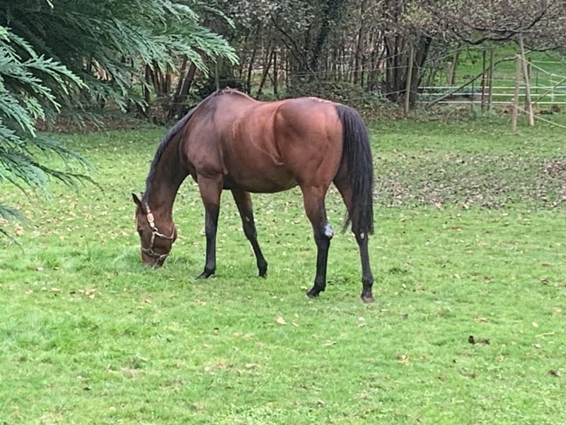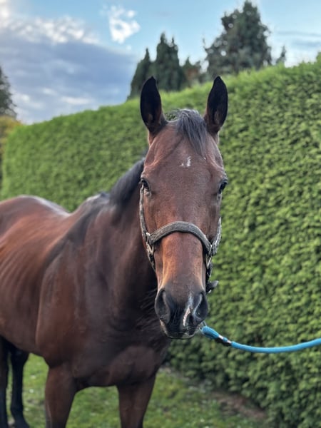 For sale is a large-frame Thoroughbred gelding, approximately 16.8 hh. He is ridden, familiar with turnout, dogs, tractors, and all everyday life situations. He has a strong nerve and remains calm under pressure. Nevertheless, he requires an experienced rider and is not suitable for beginners. He has been in my possession since 2019. Unfortunately, he had a turnout accident in 2024; prior to that, he was never ill. His left hind fetlock was treated at the clinic. This does not affect his riding ability, and he is sound with no lameness. A veterinary certificate confirms this. The joint is not damaged but will always remain slightly swollen. I am happy to provide more details upon request. He is being sold without pressure and only to a five-star home with daily turnout. In the perfect home, the price is secondary.