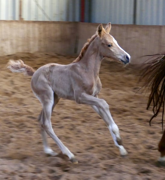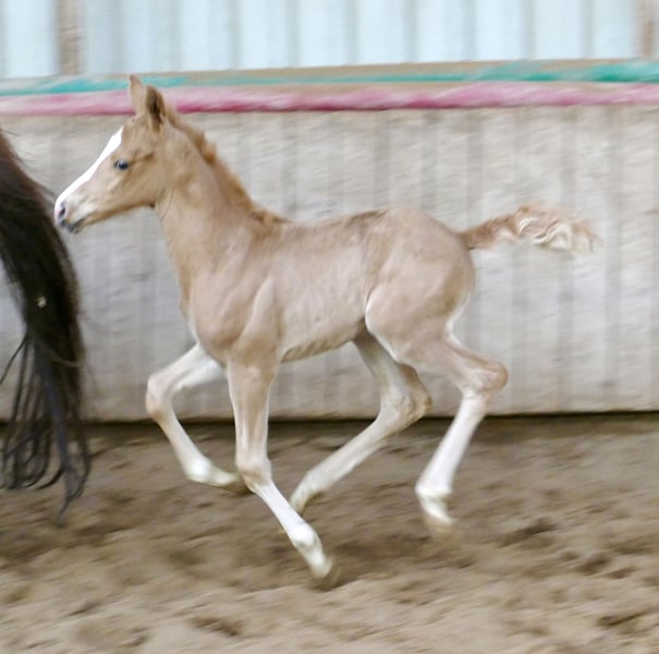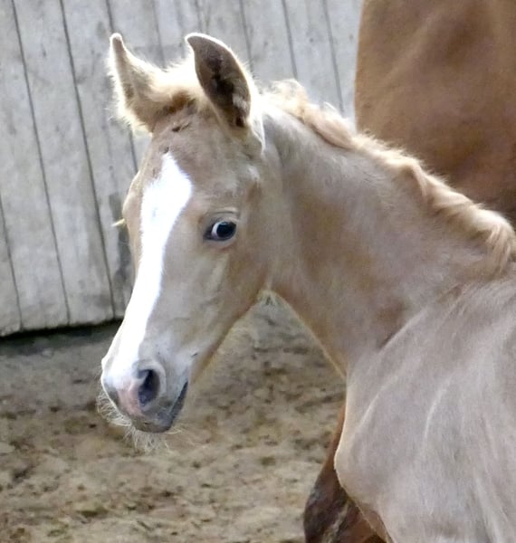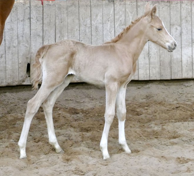 Today, new photos of our enchanting Palomino princess Marylin Gold have been taken. The daughter of Michelangelo x Ismo captivates not only with her golden coat but also with impressive movement quality and natural athleticism. She possesses everything one could wish for a future career in eventing or show jumping.