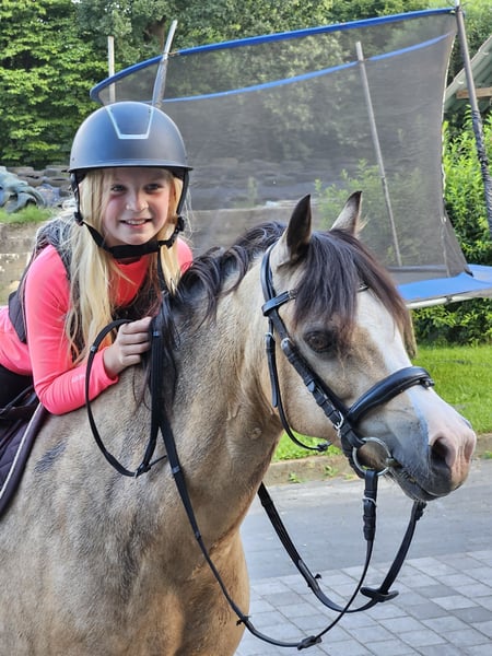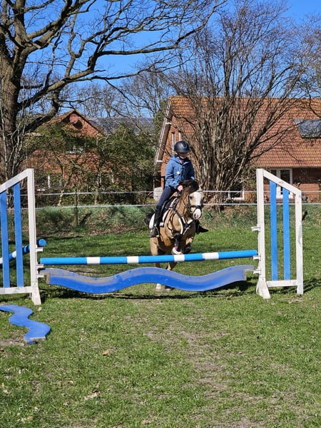 Wir suchen für unser tolles Pony die Nadel im Heuhaufen. Ja, sie ist ein Blickfang und ein Pony, das viele tolle Eigenschaften mitbringt, aber sie ist auch keine eierlegende Wollmilchsau. Kinderponys müssen hohe Ansprüche erfüllen, denn sie sollen superartig, gesund, hübsch, rittig und nicht so haltungsintensiv sein. Als Elternteil hätte man gern eine Lebensversicherung für sein Kind, denn das Reiten sollte möglichst ungefährlich verlaufen. Glöckchen bringt viele dieser Eigenschaften mit. Man ruft sie auf der Koppel und sie kommt postwendend angoloppiert, weil sie sich immer über eine Beschäftigung freut. Glöcki liebt Ausritte, bei denen sie geführt, am Rad oder frei läuft. Dies tut sie auch gern allein ohne andere Pferdebegleitung. Sie springt sehr gern, lässt sich aber auch in der Halle oder auf dem Platz gut und gern reiten. Auch an der Longe macht sie dies unkompliziert mit. Wir besitzen sie seit sechs Jahren und sind in dieser Zeit häufig zu Ausreitzielen mit ihr gefahren. Sie ist unerschrocken im Gelände, aber definitiv keine Schlaftablette. Geführt passt sie sich aber absolut ihrem Reiter an. Glöckchen hat bei einigen Ringreiten und Führzügelwettbewerben mitgemacht und meine Tochter durch den Pferdeführerschein begleitet. Wir selbst haben einen Pensionsstall und haben versucht, ihr in den letzten Jahren bestmögliche Haltungsbedingungen zu bieten. Sie ist staubempfindlich und steht bei uns aktuell auf Späne. Im Sommer steht sie bei uns 24h auf einer mageren Koppel und dabei geht es ihr lufttechnisch ideal. Sie hatte auch zu keiner Zeit Rehe oder Anzeichen dafür. Auch eine Offenstallhaltung wäre für sie gut denkbar, allerdings braucht sie Platz, um anderen Pferden aus dem Weg gehen zu können. Für sie wäre weniger Stress in einem kleineren System auf alle Fälle auch sehr gut. Glöcki ist artig beim Schmied und ihr Verhalten beim Tierarzt hat sich in der Zeit unseres Besitzes deutlich gebessert. Sie ist regelmäßig geimpft worden und jährlich zahnmedizinisch versorgt worden. Die Gabe von Wurmkuren ist bei ihr über das Futter gut möglich. Ich werde dieses Pony mit einer ehrlichen "Gebrauchsanweisung" abgeben und auch wirklich nur, wenn mein Gefühl dabei gut ist. Ich wünsche mir für Glöckchen ein wirklich tolles Zuhause, bei dem der Preis zwar zweitrangig ist, aber auch genauso wertgeschätzt wird, was für ein tolles Pony man im Gegenzug erhält.
