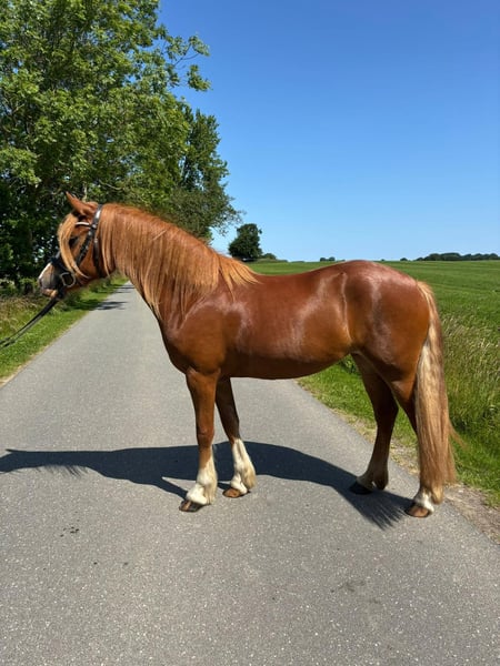 Welsh Cob Stute Ein Traumpony , zukünftiges Jugend/ Kinderpony zu verkaufen! Smilla ist 3 Jahre alt , z.Zt 148 cm und bildschön. Jeder der an ihr vorbei geht, bleibt stehen bei ihrer Ausstrahlung . Mit ihrem sehr lieben ruhigen Charakter und absolut brav im Umgang wäre sie durchaus ein tolles Jugend und Kinderpony. Oder ein ideales Mutter/ Kind Pony. Sie ist sportlich, arbeitet gern, wird dabei aber nicht unruhig oder schnell. Sie wurde gerade behutsam angeritten , wobei es richtig Spaß macht mit ihrer willigen Art zu arbeiten. Im Gelände, bisher geführt, schaut sie sich alles genau an, bleibt bei ihrem Menschen und zieht nie am Strick. Auch am Sprung macht sie eine gute Figur. Smilla liebt die Abwechslung und hat viel Freude an Neuem. Wir suchen für sie ein tolles neues Zuhause, wo sie gefördert wird und viel Kuscheln darf! Sie ist brav beim Schmied, kennt Hänger fahren. Ist natürlich regelmäßig geimpft und entwurmt. Sehr sozial in der Herde, kennt Box und Offenstall. Mit ihrer hervorragender Abstammung wäre sie auch für die Zucht ein Edelstein.