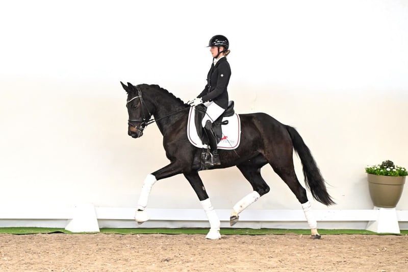 This three-year-old mare has already shown remarkable progress just five weeks after starting under saddle, as seen during her video session. For her young age, she is extremely rideable, demonstrating calmness and attentiveness—even in unfamiliar environments, during transport, and in a new arena. Her three gaits are of the highest quality: a lively, rhythmically correct trot, an uphill, expressive canter, and a ground-covering, supple walk. Even at this early stage, she shows extraordinary body control and balance, combined with a heart of gold—a mare sure to impress any rider. A pedigree that inspires confidence: Her sire, Diamantenglanz, is an exceptional stallion known for his expressive presence, dynamic, well-timed movements, and a consistently uphill canter. Currently progressing toward the higher levels, he impresses with his rideability, willingness to perform, and amiable character. As a sire, he consistently produces high-priced, successful offspring. This mare combines everything that makes a young horse desirable: expressive, powerful gaits, a willingness to learn, excellent rideability, and an outstanding character. A true talent that excites today and promises to shine in the higher levels tomorrow.