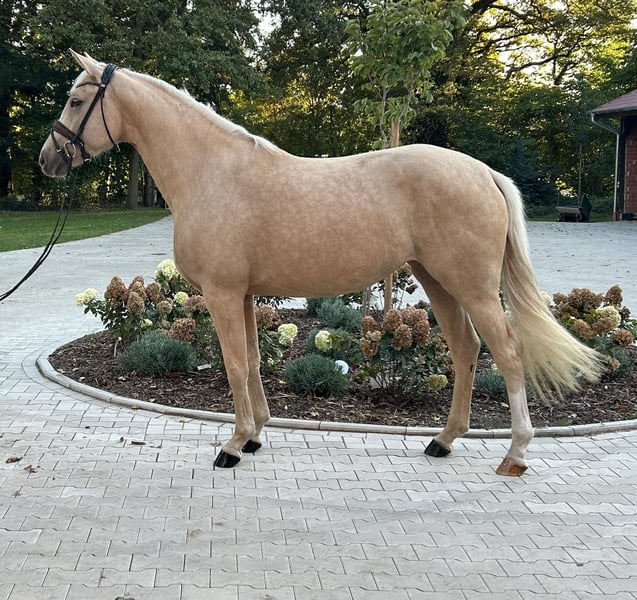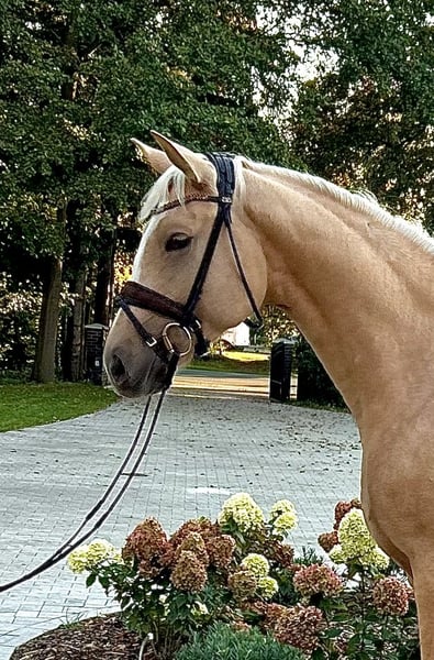 On behalf of the owner: For sale is this beautiful 3-year-old mare in the popular Palomino color. She is by V. Quaside MV. Fürst Piccolo. She has been gently backed and is suitable for amateurs to ride with ease. She has three good gaits, with her exceptional walk standing out in particular. The dream of owning a "big yellow" is now a reality! A training video can be sent upon request.