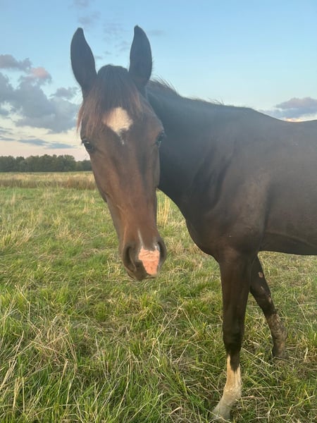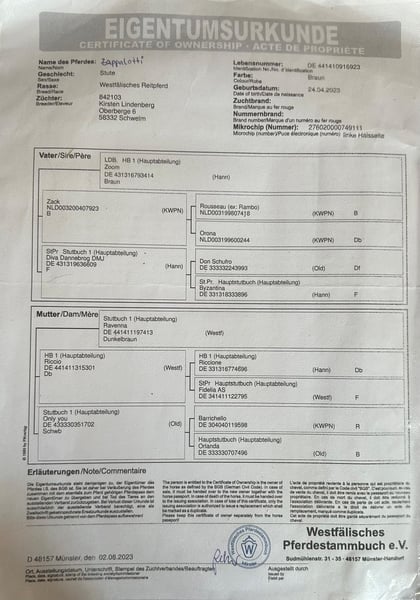 Great training horse for ambitious dressage riders. This young mare makes hearts race. She was rated with scores of 8.5-9 in all areas as a foal. Carefully raised in a large outdoor stable, she has grown up healthy and well cared for, prepared for future tasks. Zappa is just... Zappa. Brave, curious, extremely people-oriented, and eager to learn, without being pushy or overly enthusiastic. Foal ABC is in place, veterinary visits are no problem, but we don't know directly since she has never been sick. Her hooves need to be practiced more after summer pasture. She leads well with a halter and is good for transport. What more could you want from this chic young mare? Now it's your turn 😉