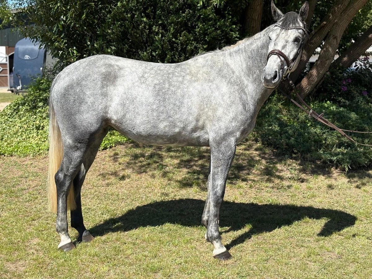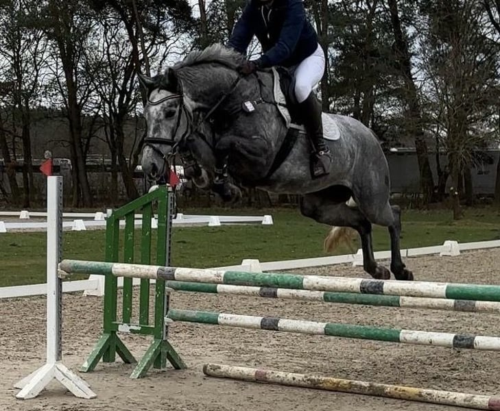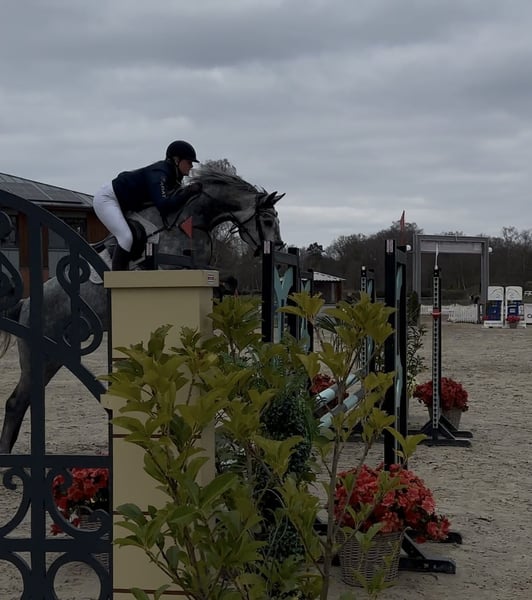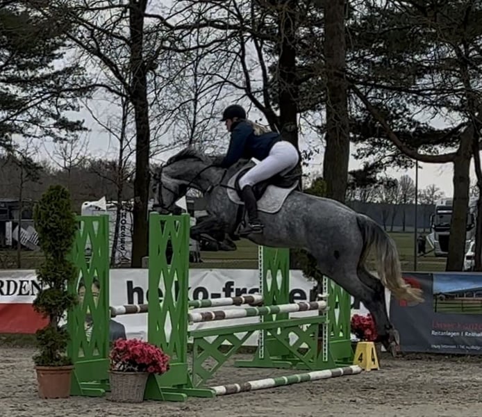 For sale is a modern, sportily built 4-year-old grey mare with striking jumping ability and very good rideability. She impresses with a light contact, works motivatedly, and shows herself to be willing and easy to ride in both dressage and show jumping. Already experienced at competitions, she has placed in Clear Rounds and has been presented in show jumping tests of class A*. Currently, she is trained up to A** and offers a lot of potential for a successful sporting future. The mare still brings her own ideas appropriate for her age and occasionally displays typical mare behavior – however, with some consistency and persuasion, she works well with her and is continuously developing. In handling, she is well-behaved, and is good for shoeing and loading. She has very good hooves and manages barefoot without any issues. An exciting young horse for ambitious riders! If you are interested or have any questions, we look forward to your message!