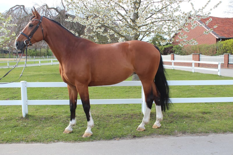 This wonderful mare is looking for a new sport partner. Luise is a nine-year-old mare. She only recently began her competitive training and has been gradually introduced to the sport. Currently, she is competing confidently at A level and has already gained some experience in competitions. In daily work, she proves to be eager to learn, so she will soon be ready for jumping at novice (L) level. Luise is easy to ride and very well-behaved, making her an ideal horse for amateur riders aiming to succeed in show jumping at A and L levels. Her good movement and consistent, beautiful jump make her also a recommended prospect for US Hunter classes. In handling, Luise is gentle and balanced. She is farrier- and loading-friendly and gets along well with other horses. Feel free to come by and meet Luise in person. Please schedule an appointment in advance.