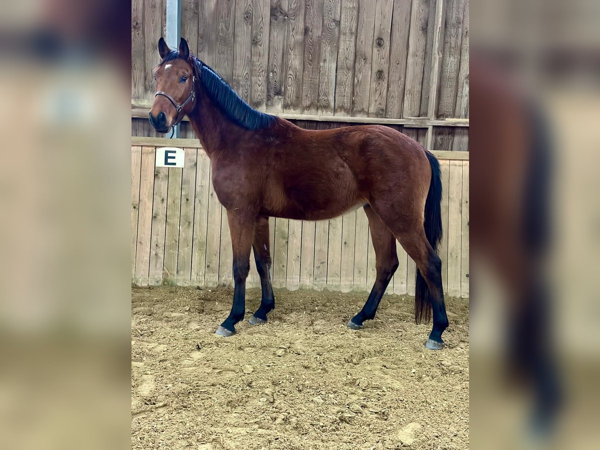 3-jähriger brauner Wallach von Ziedream aus einer Comme il Faut Mutter. Roh, halfterführig und brav im Umgang. Freispringen erstmalig.