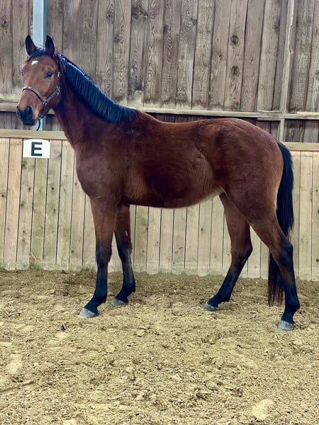 Three-year-old bay gelding by Ziedream out of a Comme il Faut mare. Unbroken, halter-trained, and well-behaved in handling. First time free jumping.