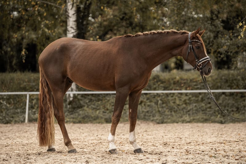 Zum Verkauf steht ein besonders typvoller und ausdrucksstarker Westfalen-Wallach von Baccardis Best x Fürst Romancier in der tollen Farbe Dunkelfuchs. Geboren 2022 ist er nun 3,5 Jahre alt und ist bereits 1,70 groß Mokka überzeugt mit drei überragenden Grundgangarten, die keine Wünsche offenlassen: ein kraftvoller, schwungvoller Trab, ein bergauf Galopp sowie ein raumgreifender Schritt. Seine natürliche Bewegungsqualität und sein Talent lassen bereits jetzt erkennen, dass ihn eine große Zukunft im Dressursport erwartet. Mokka springt bereits fliegende Wechsel auf beiden Seiten, was seine hervorragende Balance und Lernbereitschaft unterstreicht. Er ist seit Mitte des Jahres schonend angeritten und ging bereits zwei Reitpferdeprüfungen, in denen er sich sehr souverän und gelassen präsentierte mit Noten über 7 Zur Abwechslung springt er auch mal kleine Kreuzchen und nimmt regelmäßig an einer wöchentlichen Cavaletti-Stunde teil, was er mit viel Freude und Übersicht meistert. Er ist wirklich für jeden Spaß zu haben und macht alles mit, was man ihm anbietet. Im Umgang und unter dem Sattel zeigt er sich mit einem Traumcharakter – eine echte 10 von 10! Er ist im Kopf schon wie 20: immer cool, verlässlich und absolut nervenstark. Egal ob 10 andere Pferde in der Halle sind, Reklame flattert oder das bunte Vierecker bleibt er stets gelassen und bei seinem Reiter. Auch beim Ausreiten, Verladen oder auf Turnieren ist er einfach brav und unkompliziert. Trotz seines Alters muss er vor dem reiten nicht ablongiert werden und hat unter dem Reiter noch nie einen falschen Tritt gemacht. Ein junger Wallach mit bestem Interieur, großem Herz und überdurchschnittlicher Bewegungsqualität – ein Pferd, das jeden Tag Freude macht und auf eine vielversprechende Zukunft im Dressursport hoffen lässt. Röntgenbilder inkl Hals und Rücken liegen ohne Befund vor. Er wird nur in die besten Hände verkauft. Da wir kein Reit-Tourismus unterstützen werden für das Probereiten 30€ berechnet.