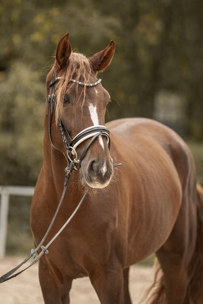 For sale is a particularly typey and expressive Westphalian gelding by Baccardis Best out of Fürst Romancier, in the stunning dark chestnut color. Born in 2022, he is now 3.5 years old and already stands at 16.1 hh. Mokka impresses with three outstanding gaits that leave nothing to be desired: a powerful, elevated trot, an uphill canter, and a spacious, ground-covering walk. His natural movement quality and talent already indicate a bright future in dressage. He is already performing flying changes on both sides, highlighting his excellent balance and eagerness to learn. Since mid-year, he has been gently backed and has already competed in two young horse classes, where he presented himself very confidently and calmly, earning scores above 7. For variety, he also jumps small cross rails and regularly participates in a weekly cavaletti session, which he approaches with great joy and composure. He is truly versatile and eager to please, happily doing anything he is asked. In handling and under saddle, he displays an ideal temperament – a true 10 out of 10! His mindset is mature beyond his years: always cool, reliable, and absolutely brave. Whether there are ten other horses in the arena, banners fluttering, or the colorful cones around, he remains calm and focused on his rider. He is also well-behaved and straightforward when hacking out, loading, or at competitions. Despite his age, he does not need to be lunged before riding and has never taken a false step under saddle. A young gelding with excellent conformation, a big heart, and above-average movement quality – a horse that brings joy every day and promises a bright future in dressage. X-rays of the neck and back are available without any findings. He will only be sold into the best hands. Please note: a €30 fee will be charged for trial riding, as we do not support riding tourism.