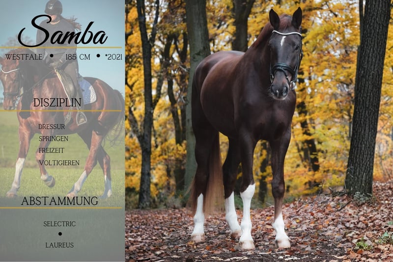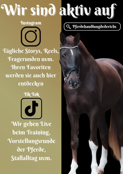 Samba is a 4.5-year-old Westphalian riding horse, approximately 185 cm, sired by Selectric, Sezuan, Zack, De Kooning x Laureus, Feuerschein II. *Samba* is an exceptional horse. A stunning, well-trained gelding with three excellent gaits and a fantastic character. He handles everything with ease, whether it’s indoor or outdoor work, riding alone or in a group. He’s used to being ridden with a halter or simply cantering over stubble fields with a pad. Samba is comfortable in water and has already jumped small fences. He is very versatile and well-schooled. Super calm and brave, he handles any desensitization training effortlessly. He’s familiar with walking through flutter tapes, plastic bottles, etc.!!! BE SURE TO WATCH HIS VIDEO!!! In handling, he is affectionate, sweet, and very people-oriented. He comes with a current large veterinary check. A current video can be viewed here in the listing or via the following link: https://www.youtube.com/watch?v=yTkk4GQFf3Y Pferdehandlung Dederichs – Ihr Partner für den Pferdekauf Kontakt & Erreichbarkeit: Anfragen bitte ausschließlich telefonisch unter 0173/9792139 Montag – Freitag: 09:00 – 18:00 Uhr Samstag: 09:00 – 15:00 Uhr Sonntag: Ruhetag Folgen Sie uns auf Social Media! Erleben Sie unseren Alltag mit den Verkaufspferden auf Instagram, TikTok & Facebook unter Pferdehandlung Dederichs Rabatt: Bei sofortiger Mitnahme Ihres neuen Traumpferdes erhalten Sie zwischen 5 % und 10 % Rabatt. Probereiten & Vorführen: • Probereiten: 30 € pro Pferd (max. 2 Reiter), Betrag wird beim Kauf angerechnet • Feiertage: Proberitt 50 € • Vorführung durch unsere Bereiter: 25 € pro Pferd (Vorreiten, Bodenarbeit etc.) Ankaufsuntersuchung & Transport: • Viele unserer Pferde besitzen bereits eine AKU • Sie können selbstverständlich Ihren eigenen Tierarzt mitbringen • Gerne organisieren wir eine Untersuchung • Wir unterstützen Sie auch gerne beim Transport ins neue Zuhause Weitere Verkaufspferde: In unserem Stall stehen weitere Verkaufspferde, die noch nicht online sind. Falls Ihr Traumpferd noch nicht dabei ist, zögern Sie nicht, uns zu kontaktieren. Wichtige Hinweise: • Stockmaß-Angaben sind geschätzt und nicht exakt nachgemessen • Alle Beschreibungen sind subjektive Einschätzungen des Verkäufers und keine zugesicherten Eigenschaften Weitere Informationen finden Sie unter: www.Pferdehandlung-Dederichs.de