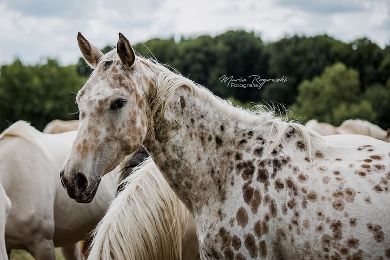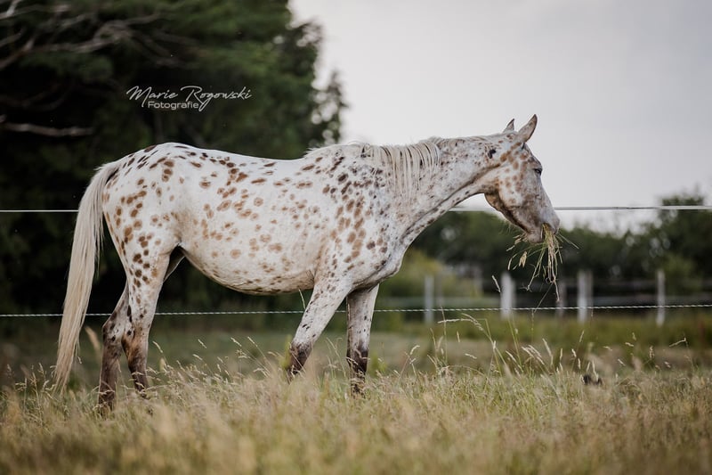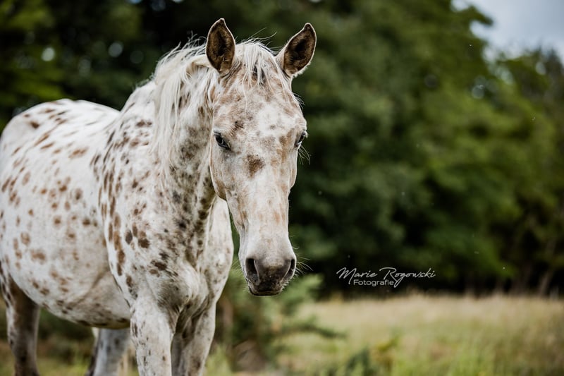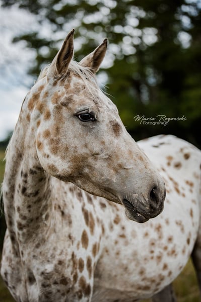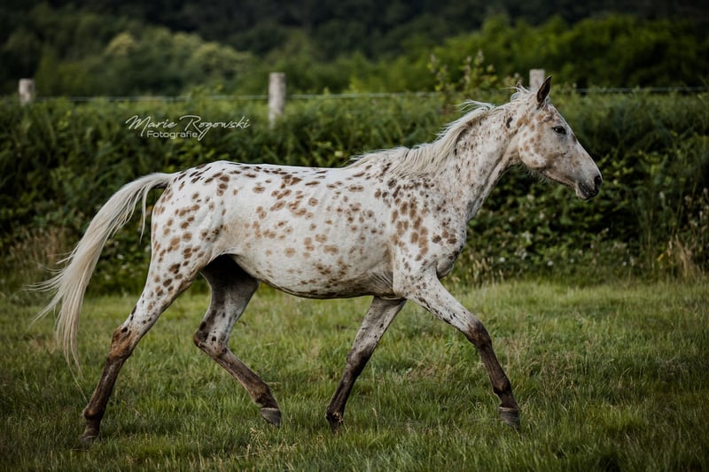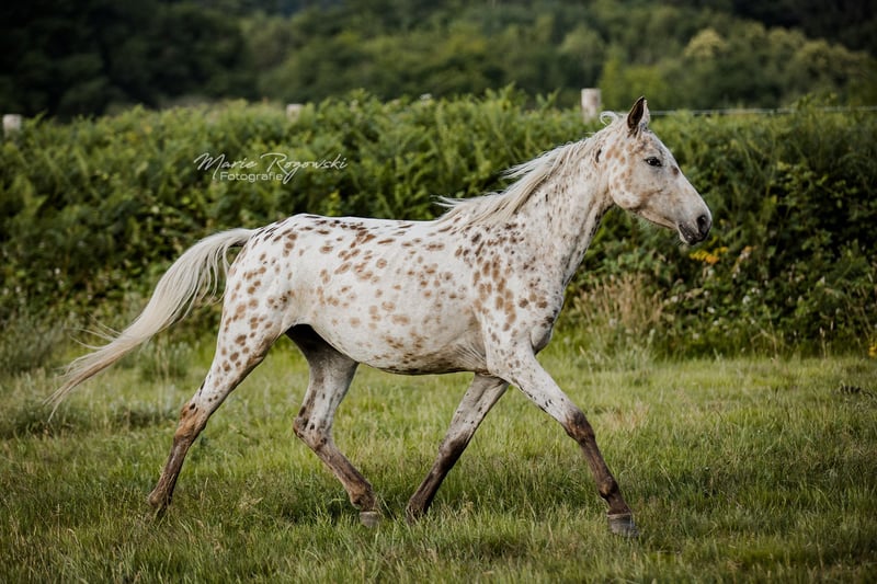 Stute | Zangersheide | Buckskin Tigerschecke | geb. 2022 CONFETTI Z ist eine junge, charismatische Stute mit auffälliger Buckskin-Tigerscheckung und ausdrucksstarkem Kopf. Sie ist noch recht zierlich und klein für ihr Alter und wird sicherlich noch nachlegen, sind doch sowohl ihr Vater wie auch ihre Mutter recht großrahmig. Im Umgang präsentiert sie sich freundlich, neugierig und recht sensibel. Ihr Vater Carlsson vom Dach wird als großer, stattlicher Knabstrupper-Hengst beschrieben, der für raumgreifenden, taktsicheren Schritt, schwingenden Trab und ausgewogene Galoppade bekannt ist. Sein Charakter wird als furchtlos, intelligent und leistungsbereit angegeben. Ihre Mutter White Beauty GF bewährte Zuchterfahrung und Veranlagung für sportliche Pferde liefert. Confetti Z vereint damit attraktive Farbe, Bewegungsqualität und Zuchtwert in einem jungen Pferd.