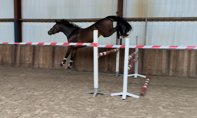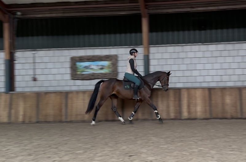 Nice, well-bred and healthy 5-year-old mare. Cornet Obolensky x Colandro. Around 1.63m. Sweet and easy horse to handle, correct and healthy. Still a bit green under saddle but definitely honest and well-behaved! She is being slowly ridden here and prepared for the course! A great opportunity to buy a nice horse with an uncomplicated character. She definitely shows potential for the sport! Free from stable vices! ☎️ 06-10197456 Oud Gastel, NL